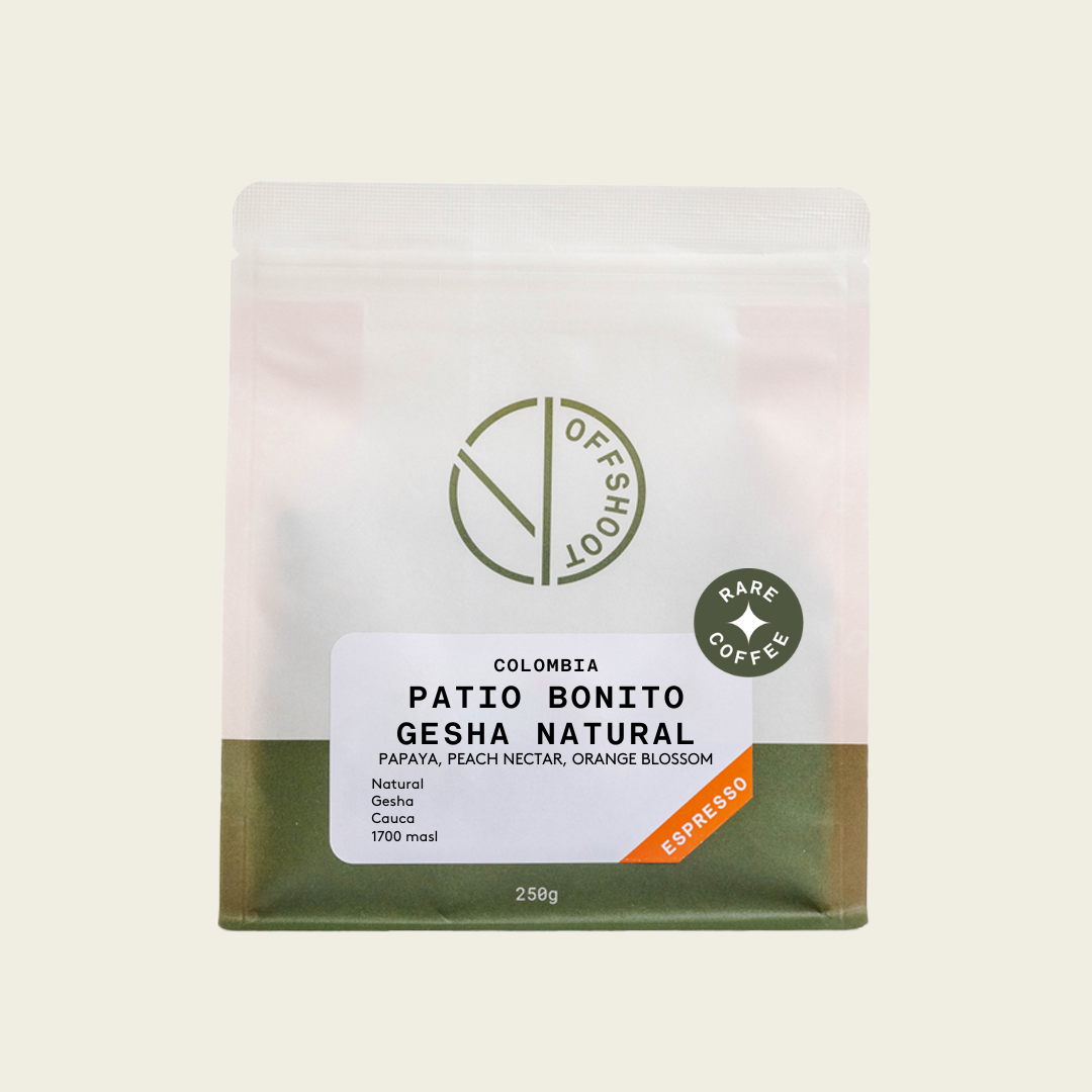 This natural Gesha is one of the jewels of Patio Bonito. Grown at 1700 masl and dried in cherry to preserve its lush fruit character, it produces a deeply aromatic espresso with layers of papaya, ripe peach nectar and a lingering orange blossom finish. The natural process elevates the variety’s tropical sweetness while maintaining the elegance, clarity and floral lift that make Gesha so iconic. A vibrant yet clean cup that showcases the Trujillo family’s commitment to excellence.